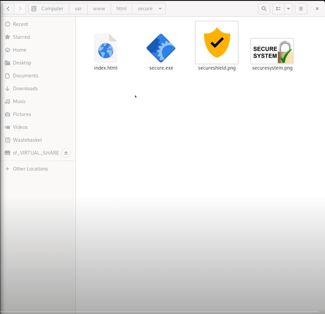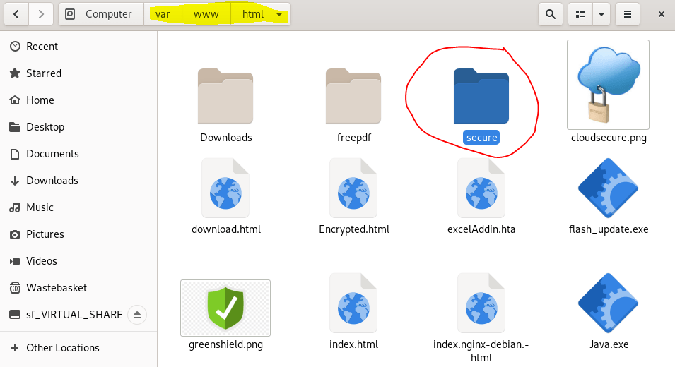 We browse to the location at “/var/www/html/” then create a new folder named “secure” which is for our new web site.