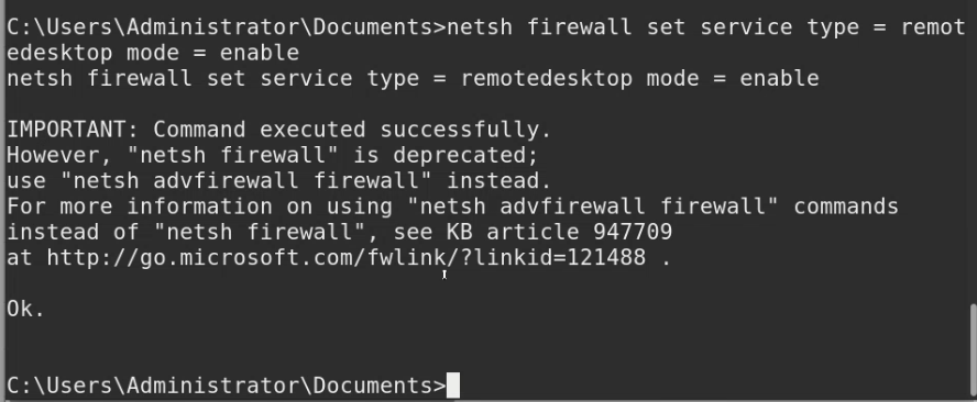 - reg add “HKEY_LOCAL_MACHINE\SYSTEM\CurrentControlSet\Control\TerminalServer” /v fDenyConnections /t REG_DWORD /d 0 /f