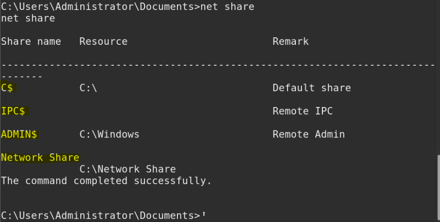 Used without parameters, net share displays information about all of the resources that are shared on the local computer. We see 3 shared locations, including the “Network Share” This would be a good place to start any file searches for “passwords” “payment” etc.