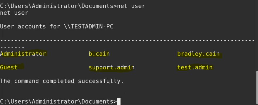 Used without parameters, net user displays all of the user accounts on the local computer. We can see the six available on the victim currently, however this will soon be seven.