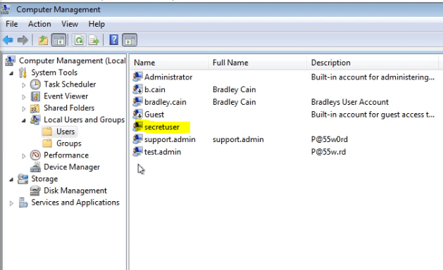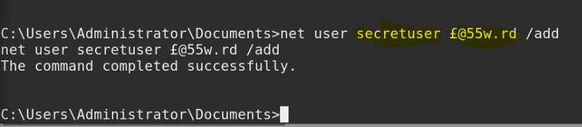 Let’s create a new user named “secretuser” with the password “£@55w.rd”. Now in the real world this will be named to make it blend in with other accounts, they will follow your naming standards and make sure it does not stand out.