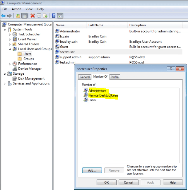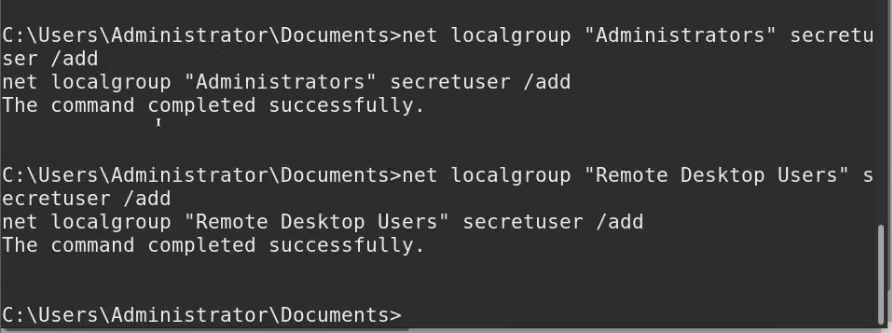 The command completes successfully and on the victim machine we can see the new account. Now a standard user account is not much use to us at this point so we want to add it to some groups which will allow us remote access and higher permissions. In this case we add it to the “Administrators” and the “Remote Desktop Users” groups.