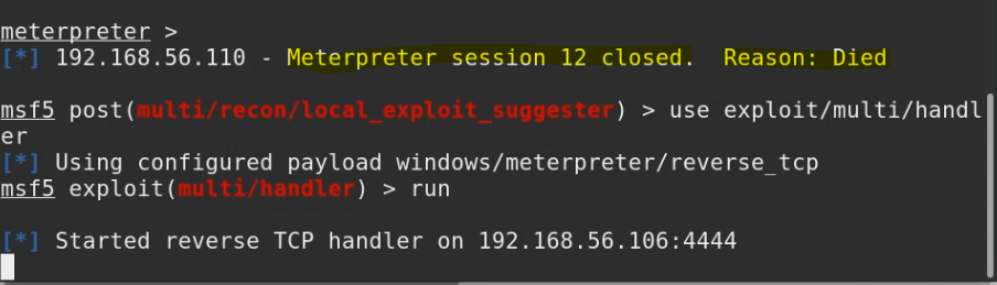 To run the metasploit exploit suggester we need to exit from Windows and meterpreter and load the module, so we use exit, and then background our session.