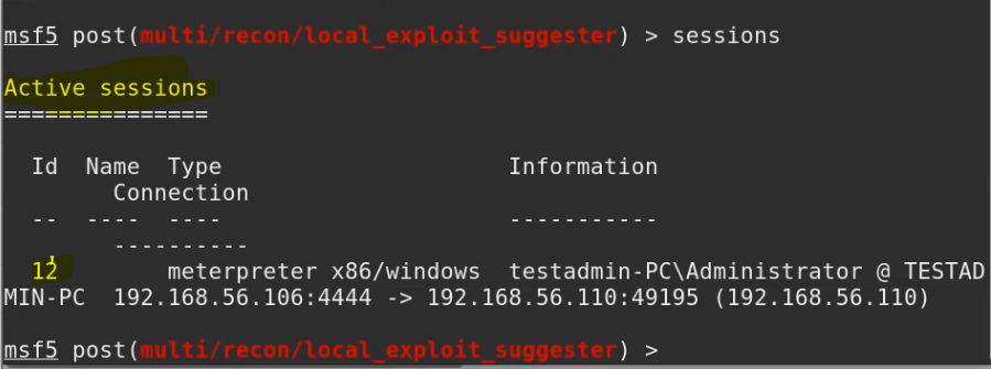 We need the session number so we use the sessions command to find the session we want, then use set session to add it. (In our case 12