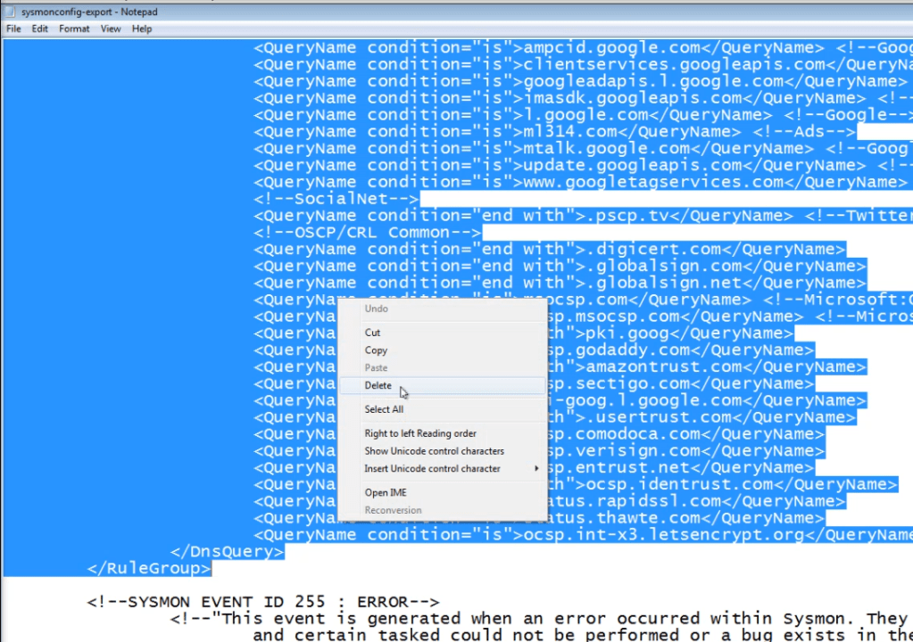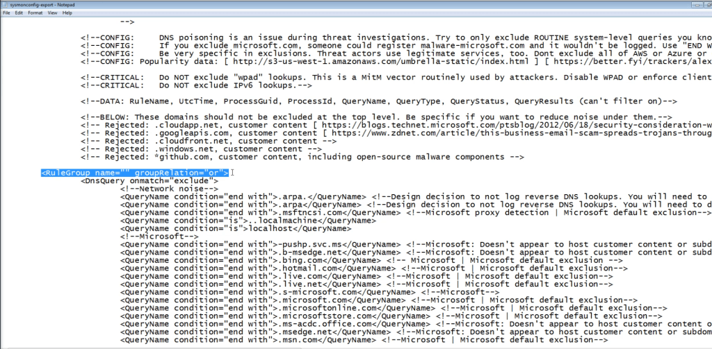 Find the DNS query section, then from “<RuleGroup name=”” groupRelation=”or”> highlight and delete the whole section.