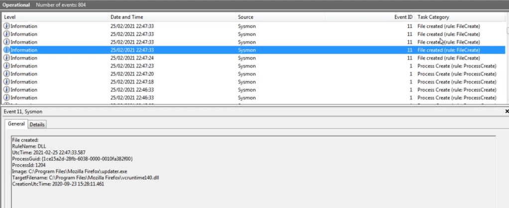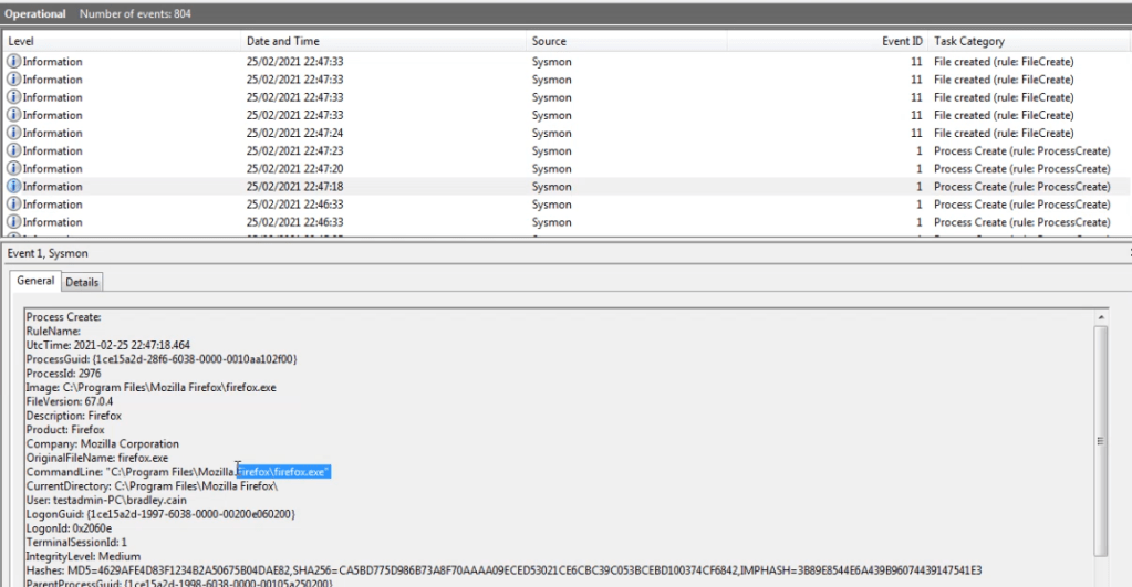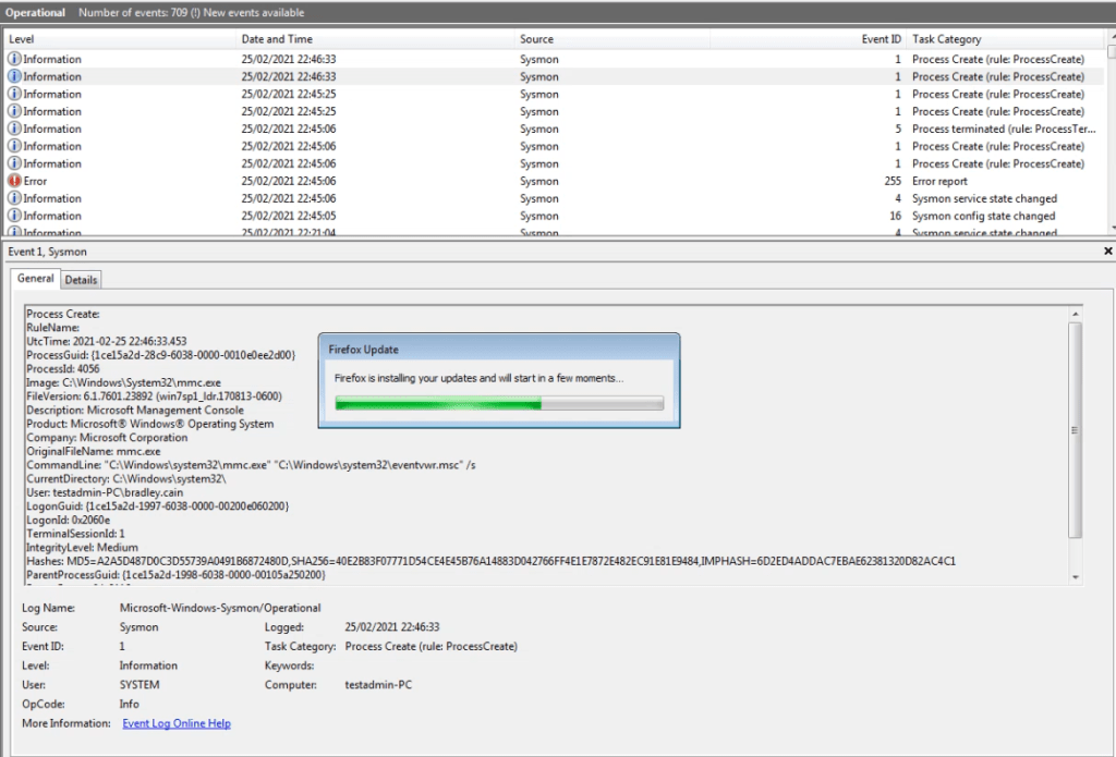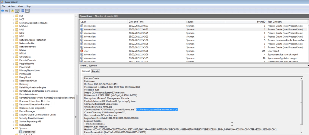 The below image shows Sysmon logging us opening Event Viewer