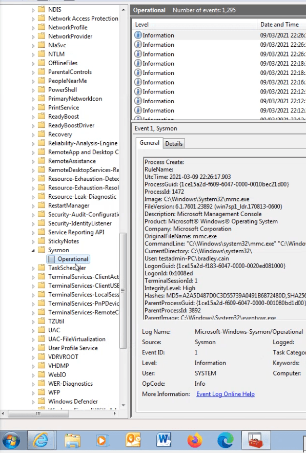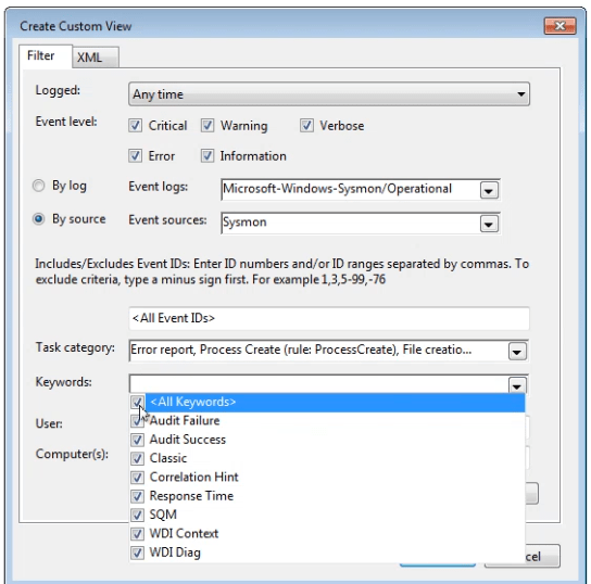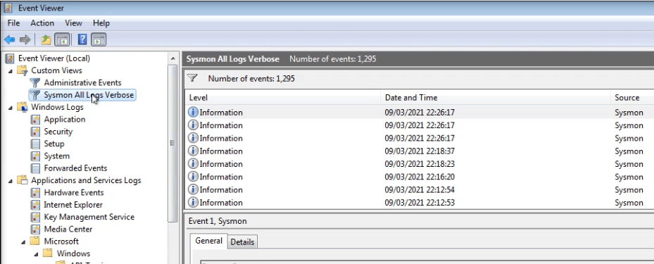 You’ll find sysmon logs under Event Viewer > Applications and Services > Microsoft > Windows > Sysmon > Operational so let’s open up Event Viewer and create our custom view.(Although we are using Windows 7 here in our lab, the commands are exactly the same in Windows 10)