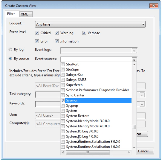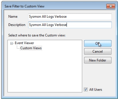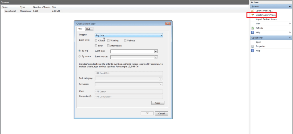 However back to today’s blog. We don’t want to have to go searching for sysmon logs and sometimes we want a different level of logging, either verbose or brief depending on how much information you wish to see, which is where custom views come in handy. In this demo will will create a verbose log which will show everything, however in other demos we will create custom views for very specific logs and events. As we are starting from scratch here, we want to see everything.