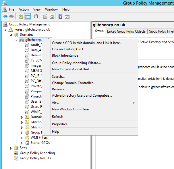 First we open Group Policy Management Console on our DC, to create a new GPO for our forwarding rules. For the purpose of this tutorial our test domain is named “glitchcorp.co.uk”, wherever you see this you should replace with your own FQDN.
