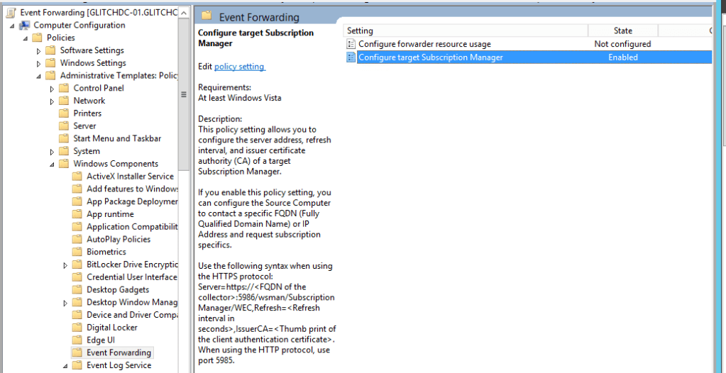 Go to “Computer Configuration/Policies/Administrative Templates/Windows Components/Event Forwarding” to create our Target Subscription – basically the log server which will be collecting all the forwarded logs (EL). Right-click the highlighted option.