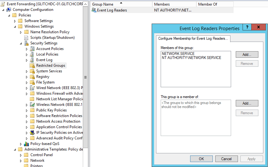 Save the configuration. Now we set permissions for the Security log to ensure it can be read. Go to; “Computer Configuration/Policies/Administrative Templates/Windows Components/Event Log Service/Security” Right-click and “edit”