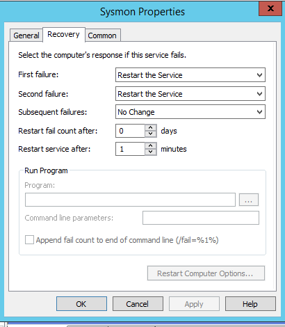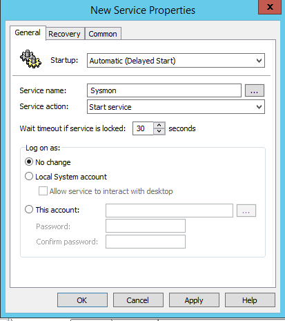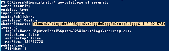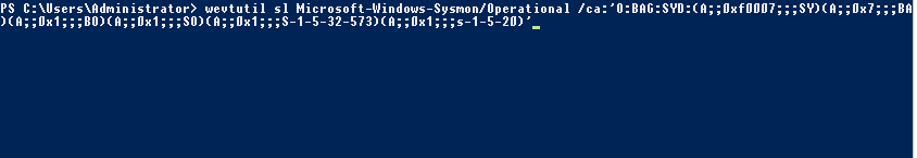 We use “wevtutil.exe” to get the existing permissions and add the new account to the end. Run the command below then copy the string that is returned. Paste this into your “Log Access” box but at the end add either (A;;0x1;;;NS) or (A;;0x1;;;S-1-5-20). This will give the “NETWORK SERVICE” read access to the logs. (NOTE: Due to the way Sysmon works this will not grant access to Sysmon logs. We will set this in the Registry using a different method)