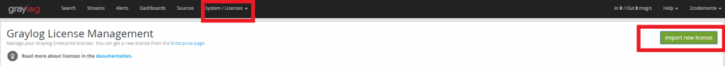 While the server is rebooting hopefully you should have received an email which contains instructions for getting your license key. Once you have your key you need to head back to Graylog and import our key. Go to the “Systems” Tab and select “License”. Then select the “Import New License” button and paste in your license.