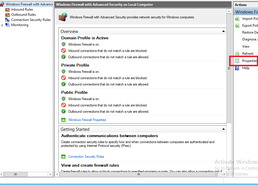 Let’s jump straight in. Open Windows Firewall With Advanced Security, then select “Properties” from the right-hand side of the page.