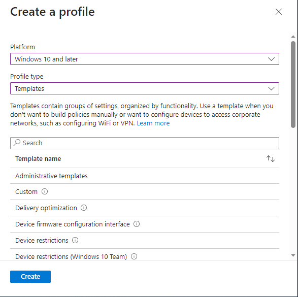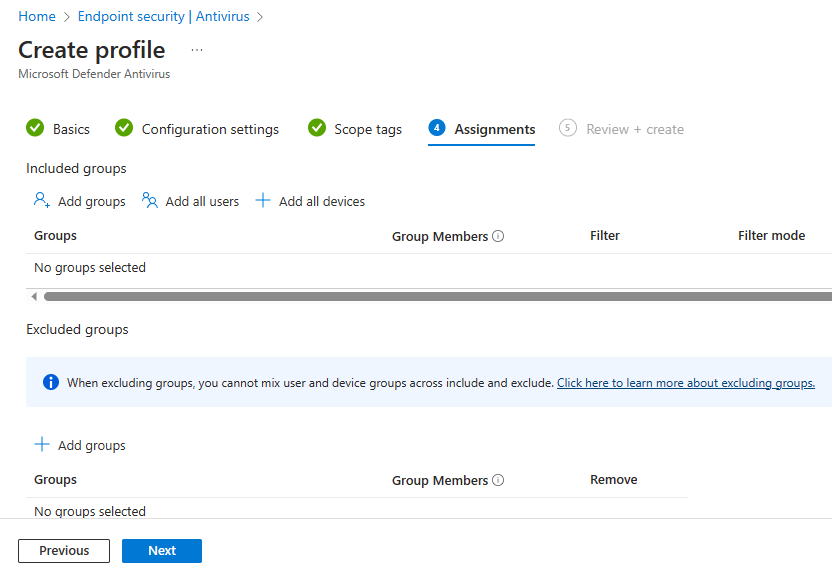 For the profile settings select the platform as “Windows 10, Windows 11, and Windows Server”, and the profile as “Microsoft Defender Antivirus”, then “Create”.