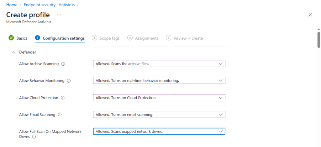 All the available settings for this profile are available here. Jeffrey Appel also has a great blog series on configuring MDE settings which you can see here. We configure our settings as in the below screenshots.