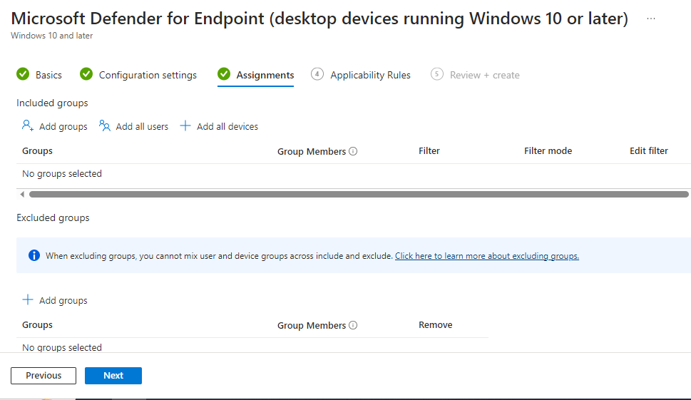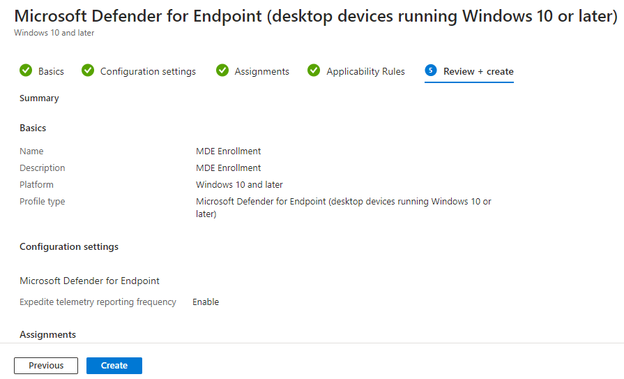 “Applicability Rules” are left as defaults, then we go to “Review + create”. Make sure you are happy with the settings then create the profile.
