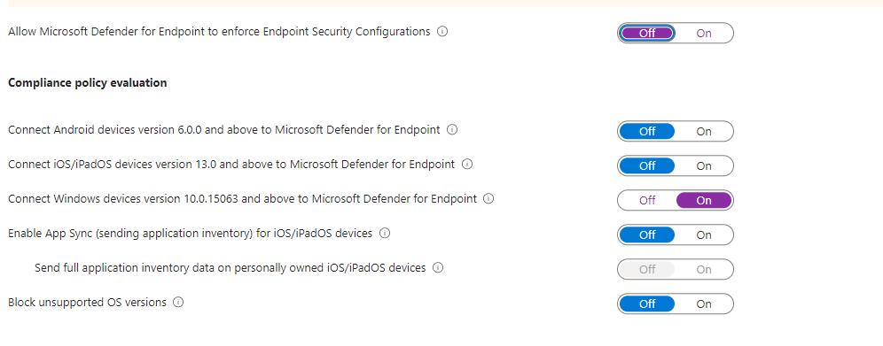 There are a few other settings to enable if we scroll down on this page. We have configured ours as below, although you may want to block unsupported OS versions, and if you will be using MDE on IOS or Android you will want to enable the setting to allow them to connect.