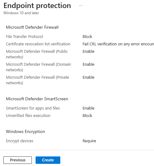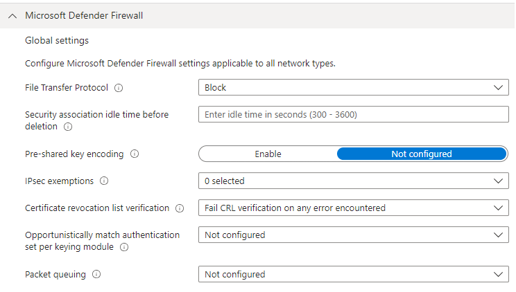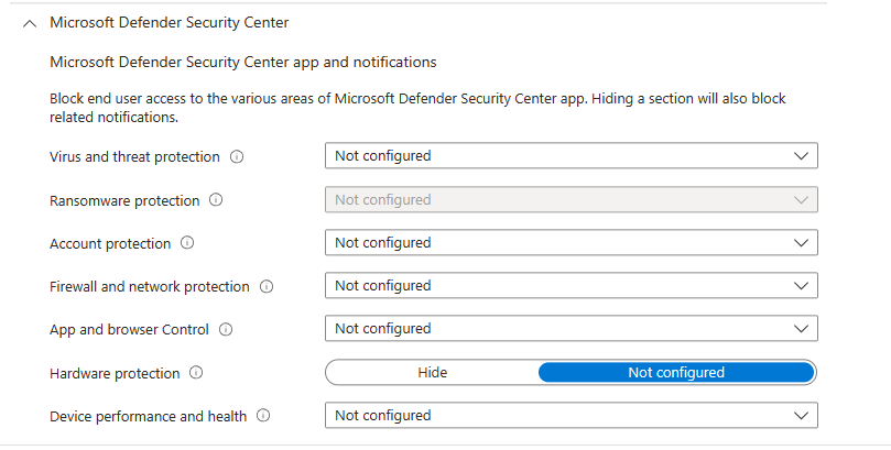 “Controlled folder access” is left unconfigured > “Network Filtering” > “Network Protection” enabled.