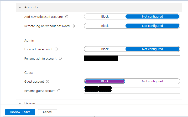 “Local device Security options” > “Accounts” > it’s good practice to rename default accounts. We are leaving the local admin enabled at this point for testing, however once confirmed we will also disable the built in administrator account.