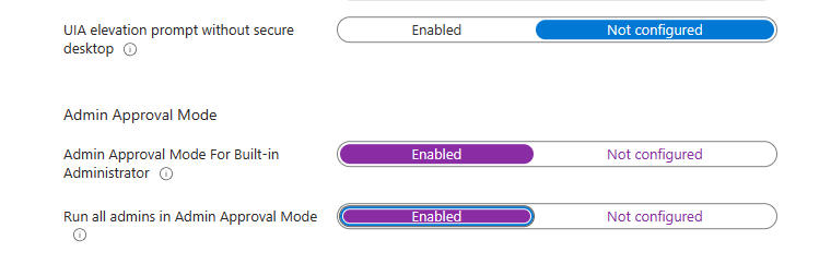 “User Account Control” > We’re going to require credentials for any elevation request and enable admin approval mode for all admin accounts. (This may not be practical for your environment but we want to enfirce it for our environment).