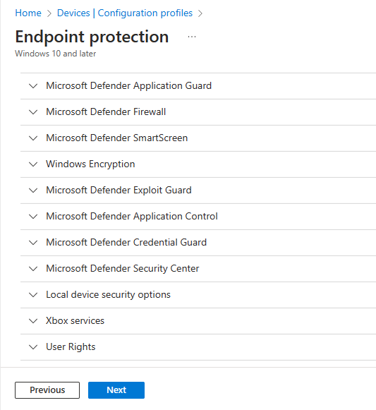 To create our configuration we go to https://endpoint.microsoft.com > “Devices” > “Configuration Profiles” > “Create Profile”. Select “Windows 10 or later” then select “Templates” > “Endpoint Protection” from the below dropdown then hit “Create”.