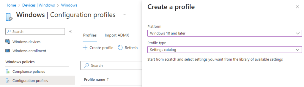 Our profile will be for Windows 10 and later and the Profile type will be “Settings Catalogue” rather than a template so we have all the settings available to us, then hit “Create”.