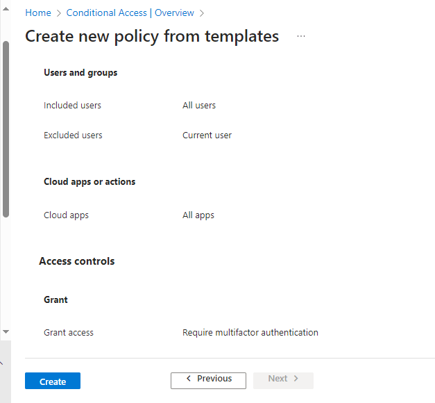 Currently we can see that this policy applies to all apps and all users, but don’t worry we can change these if required after the policy is created.