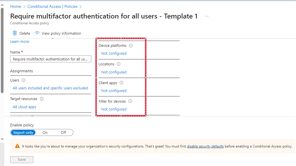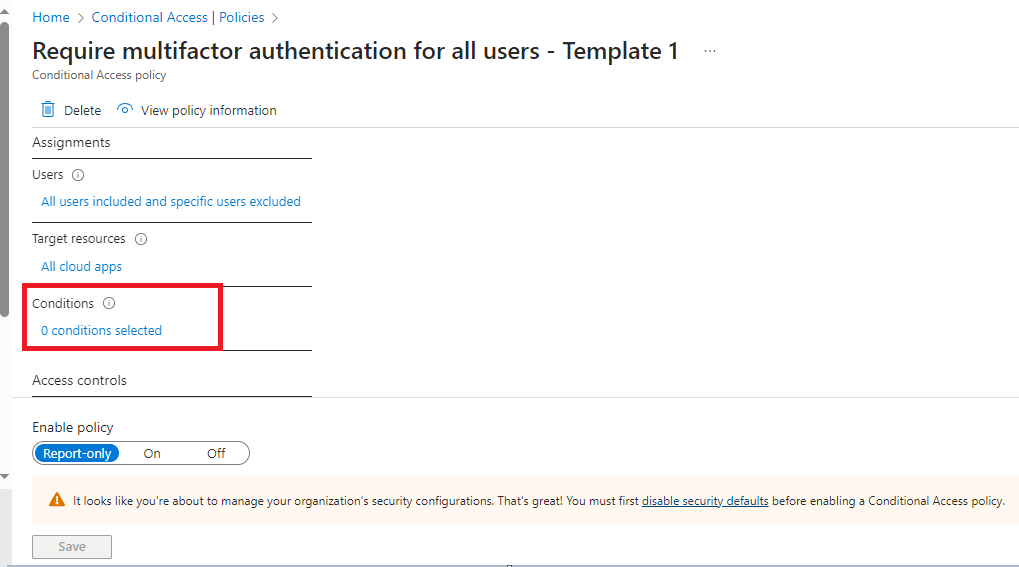 Let’s go into the policy and take a look at what is configured within the template. As you can see there are currently no conditions applied which means all users will be required to use multifactor authentication at every login (Except the user account that created the policy as they are automatically excluded to ensure you are not instantly locked out of your tenant!).