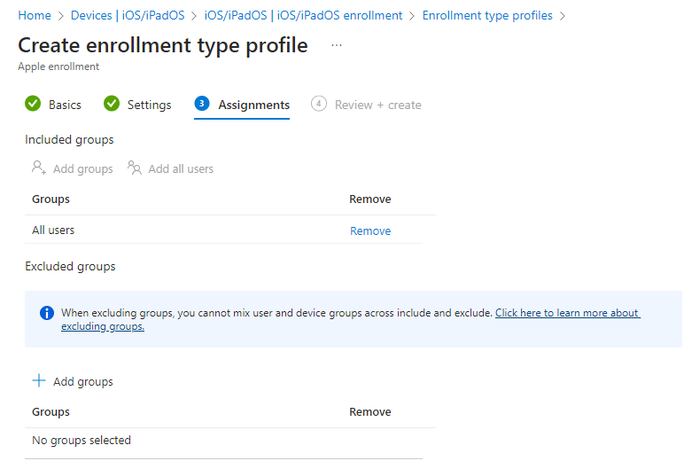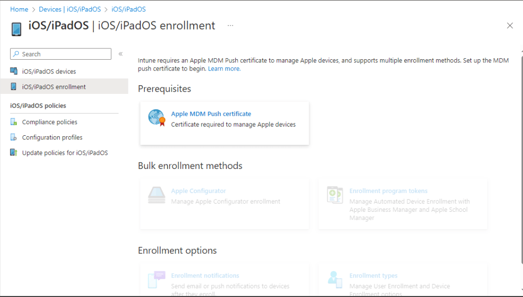 Now when we go to the same page at https://intune.microsoft.com > “Devices” > “iOS/iPadOS” > “iOS/iPadOS enrolment” > we will see the other tiles are now available.