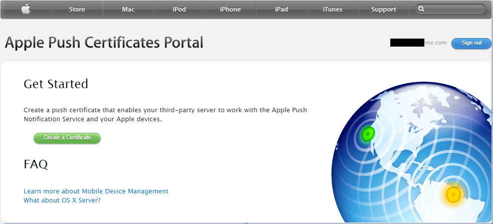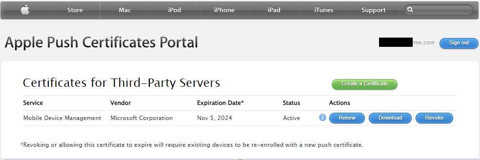 Now we need to login to the Apple portal using the provided link in step 3. We can use any Apple ID to create our certificate, but ideally we want to use a company managed ID so we don’t lose access to our certificate, and can manage it centrally with oversight. Once you have logged in with the selected account, and click on “Create a Certificate”.