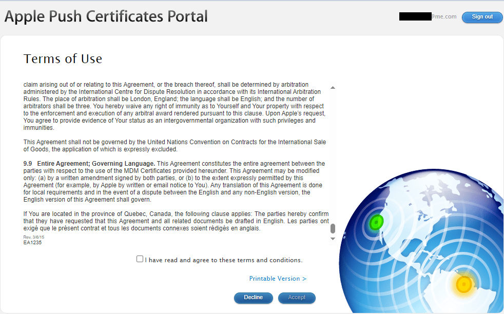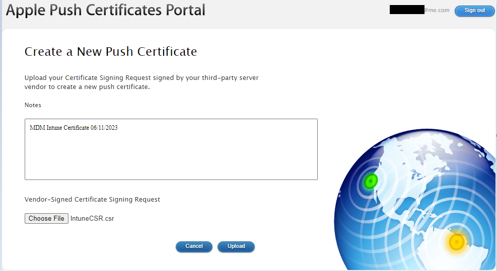 We need to go back to the Intune portal, enter the Apple ID we used to create our certificate and then upload our certificate (the “.pem” file).