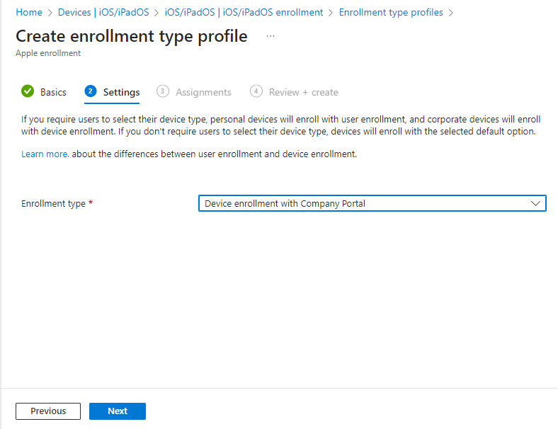 Now we have our MDM push certificate we can create our enrolment profile. We will be using device enrolment with company portal, this will require a user to be associated with the device, and that the OS versions for both iOS and iPadOS are 13.0 and later.