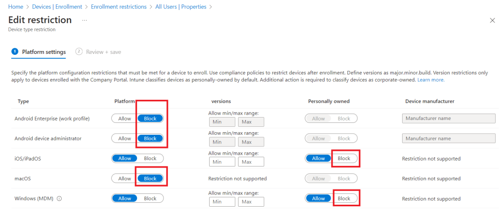 Configure as required for our environment. We can see that we have the option to block ALL of a certain platform, or allow corporate owned devices of a certain type, but block personally owned devices of the same type without affecting our organisational devices.