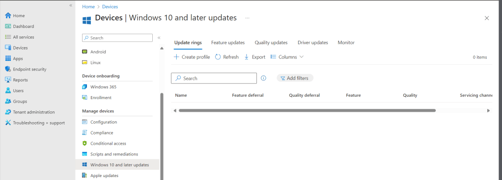 First off we will configure an update ring for our main deployment group so from within the Intune portal at https://intune.microsoft.com > Devices > and scroll down to “Windows 10 and later updates” > Ensure that “Update Ring” is selected in the top menu and then select “Create profile”.