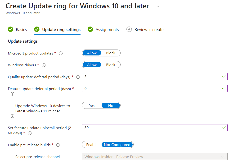 We will enable Microsoft Product updates, and Driver updates (We will be configuring a Driver update policy to work in tandem with our Update ring policy), we will defer quality updates by 3 days, and leave Feature updates to 0, as this allows it to be configured within the Feature Update policy (which we will create later).