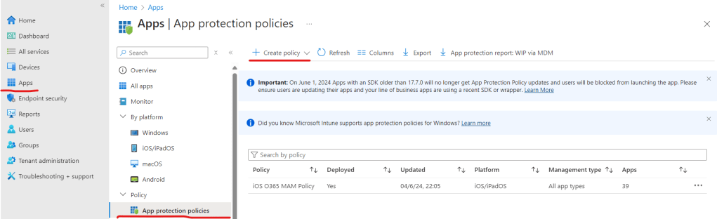 We need to head over to the Intune portal at https://intune.microsoft.com/ > Apps > App protection policies > Create policy.