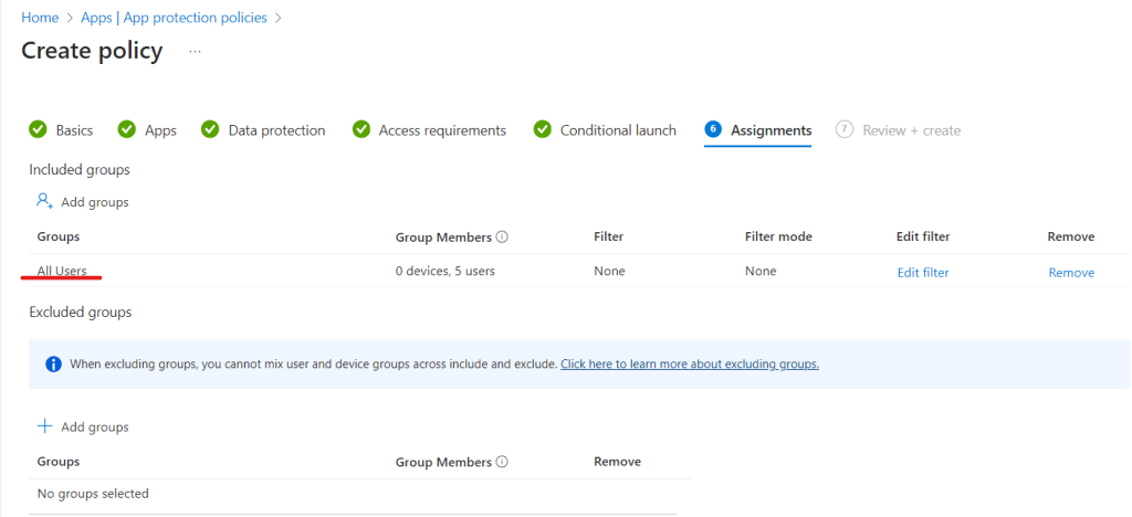We are going to apply this to the “All users” group, this ensures that any user who connects to corporate data with these device types will fall under the policy. This won’t affect devices which are onboarded to Intune (corporate devices).