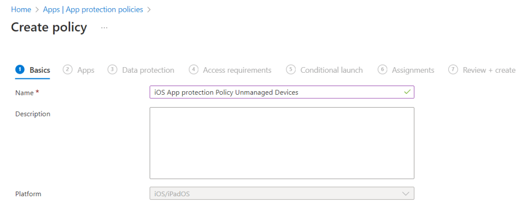 As previously mentioned app protection policies are OS specific so we will need to make a policy for all device types to cover us across all platforms. In this guide we will cover iOS only, but the steps for Android are almost identical.