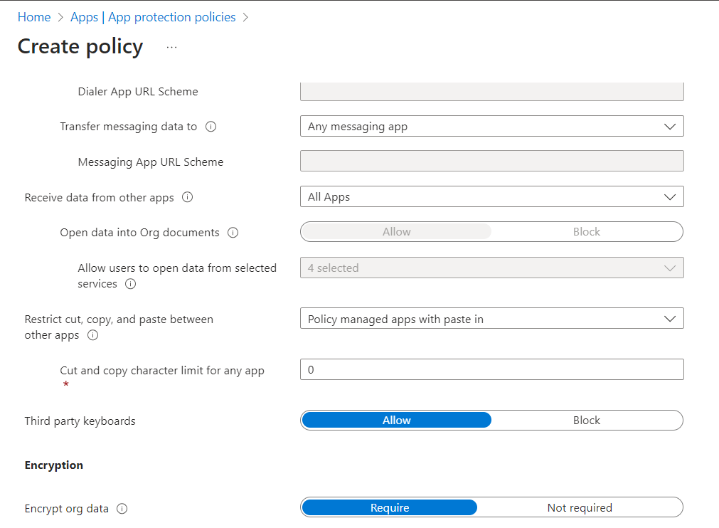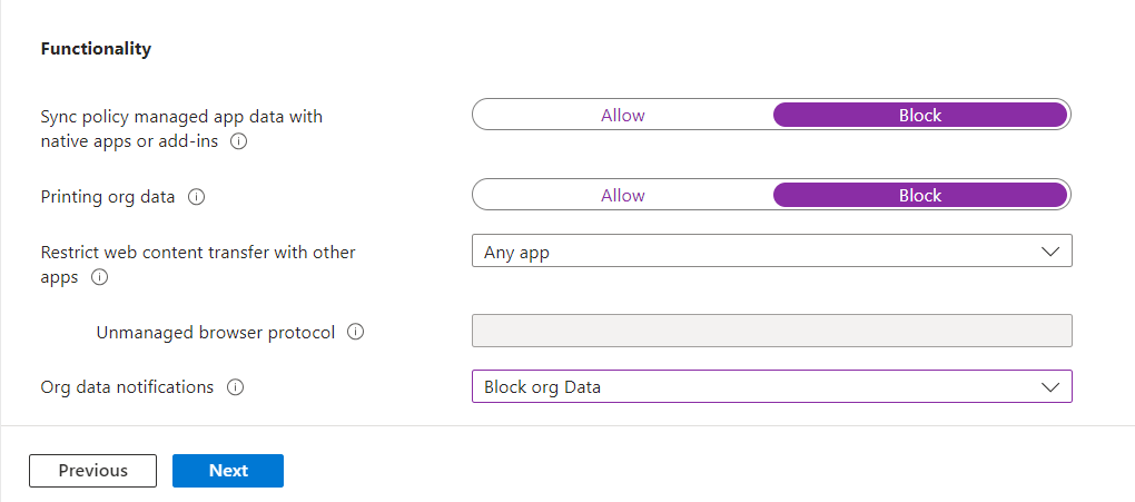 Next we configure our data loss prevention controls as shown below. We are blocking corporate data from being backed up to iTunes and iCloud, blocking data from being copied from managed apps to either unmanaged native apps or local device storage. We are allowing them to save data from unmanaged devices to OneDrive or SharePoint (“2 selected” dropdown).