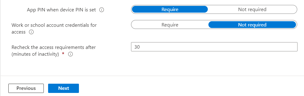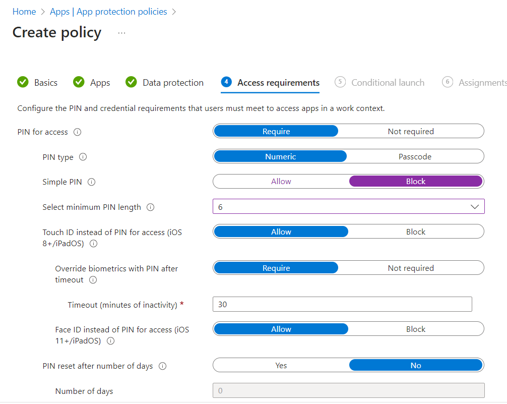 Here we set the requirement for a PIN to access apps, block simple PINs such as 1111, and set the minimum length.