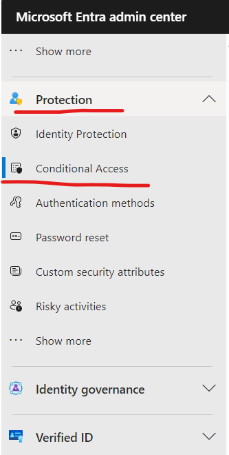 First we start in the https://entra.microsoft.com/ portal and create our Conditional Access policies by going to “Protection” > “Conditional Access”.