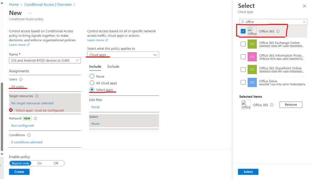 Select “Create new policy”, target “All Users”, (unless this is not appropriate for your tenant) select “Cloudapps”, and then “select apps” radio button to chose “O365” then select as shown below.
