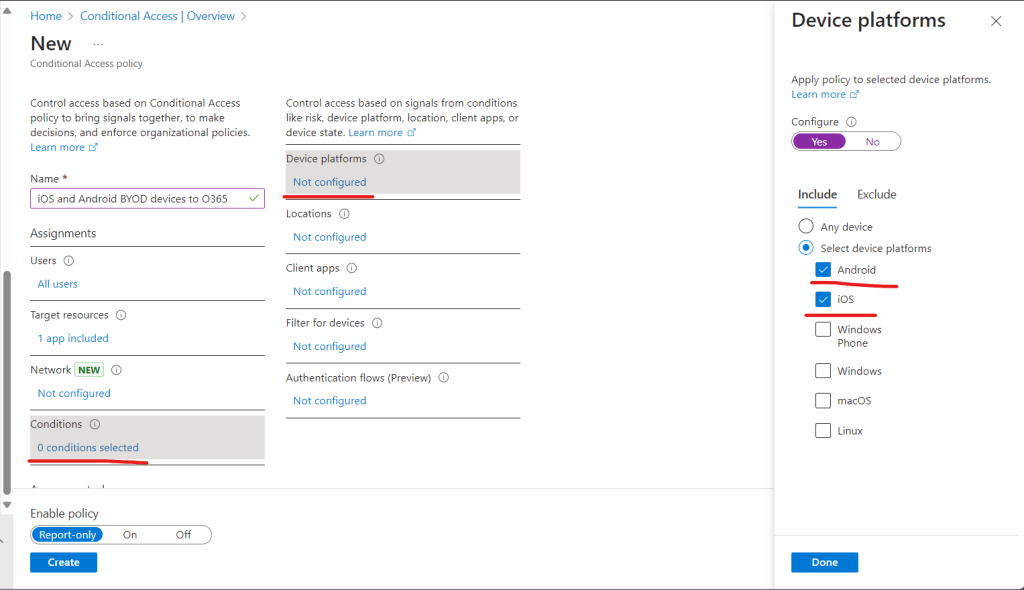NOTE: We can create one Conditional Access policy for both iOS and Android, however when we progress to the App Protection Policies we will need multiple policies, one for each OS type.