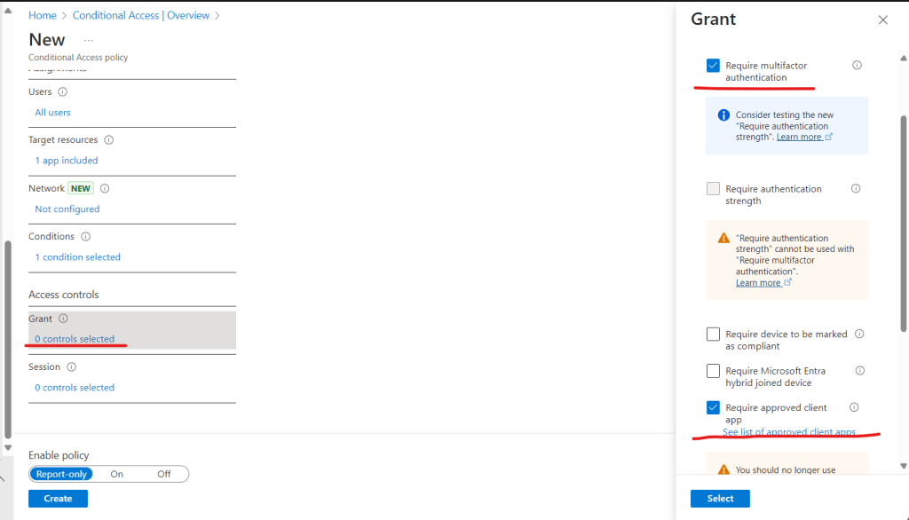 Next we configure “Grant” > and tick “Require multifactor authentication” and “Require approved apps” as below.